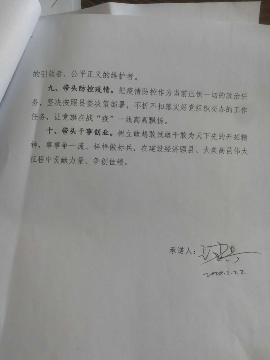 時(shí)間:2020-02-23 來(lái)源:“我承諾,帶頭做到不搞聚會(huì)、減少外出,帶頭宣傳防疫知識(shí)、抵制謠言散布,帶頭承擔(dān)急難險(xiǎn)重任務(wù)、聯(lián)系服務(wù)職工群眾,在企業(yè)疫情防控和復(fù)工復(fù)產(chǎn)中踐行好黨員的初心使命。”